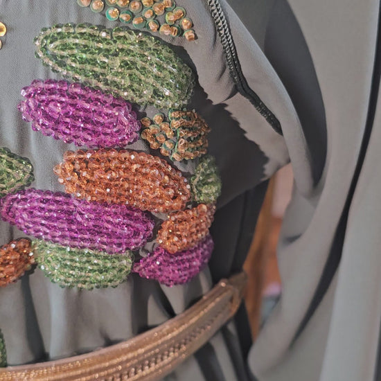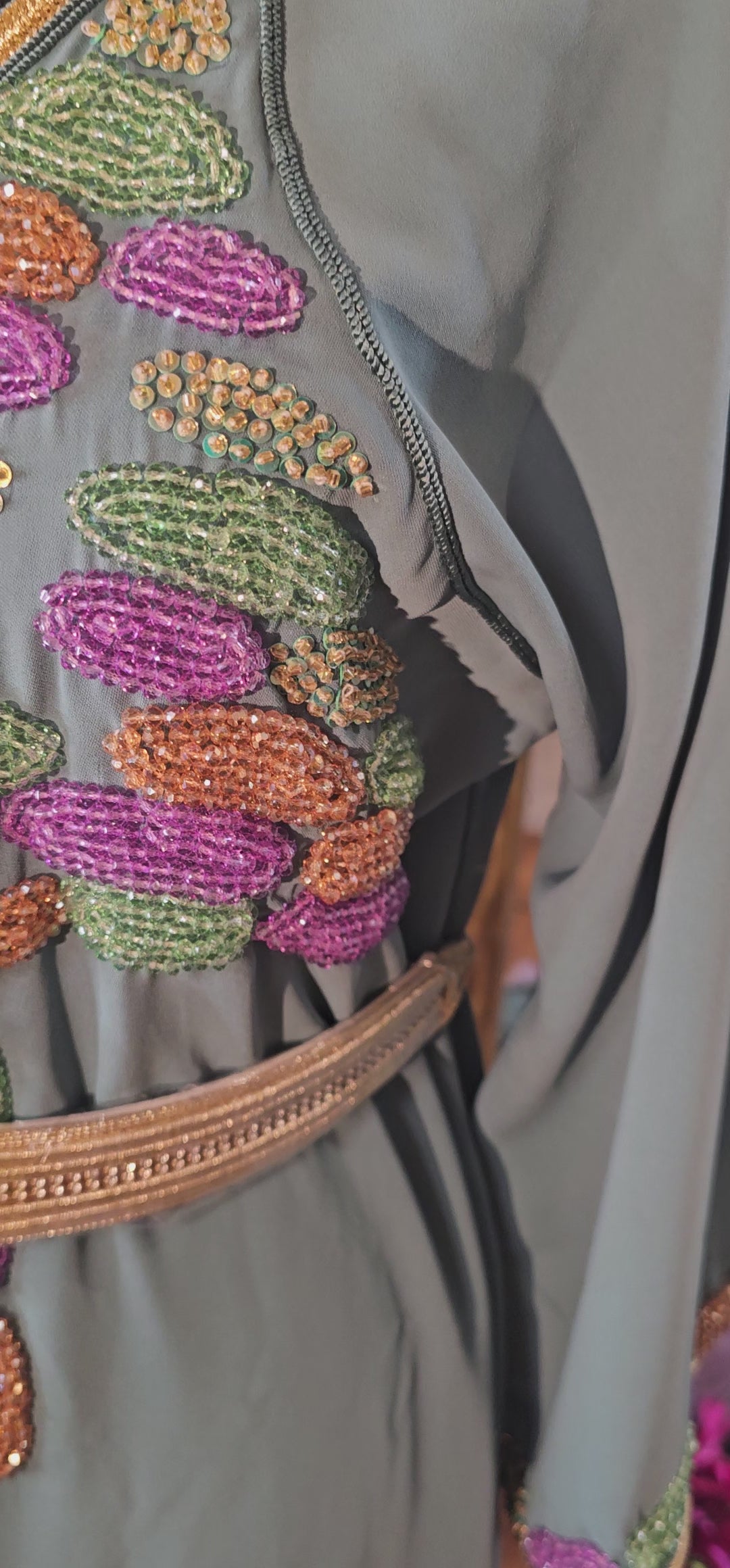 Celebrate tradition and elegance with this handmade Moroccan kaftan, crafted with care and rich cultural detail. Featuring intricate embroidery, colorful beadwork, and a flattering belted design, this kaftan is both a statement of style and heritage.
