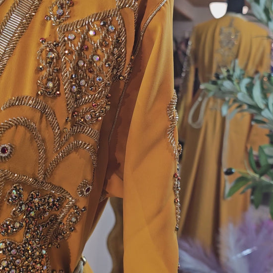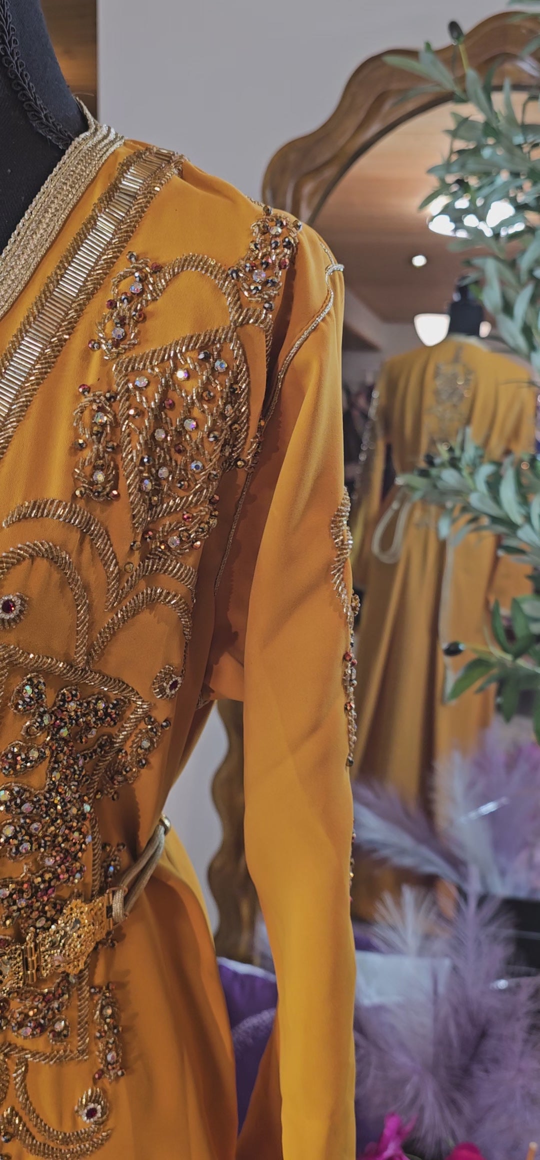 Celebrate tradition and elegance with this handmade Moroccan kaftan, crafted with care and rich cultural detail. Featuring intricate embroidery, colorful beadwork, and a flattering belted design, this kaftan is both a statement of style and heritage.